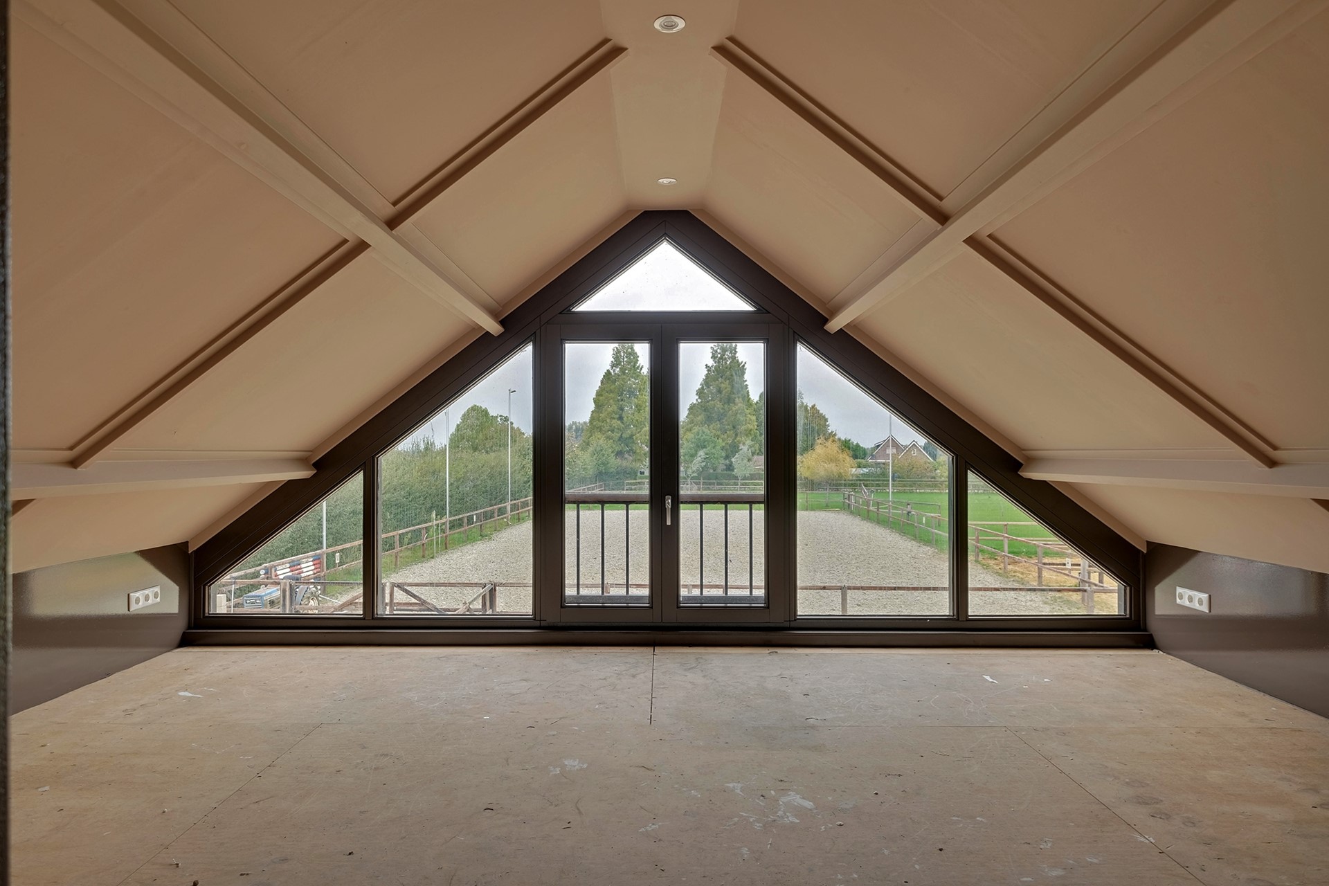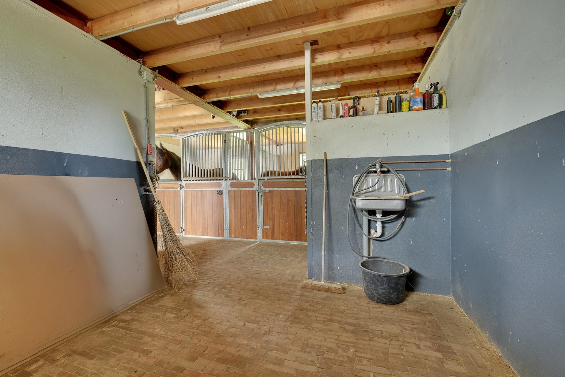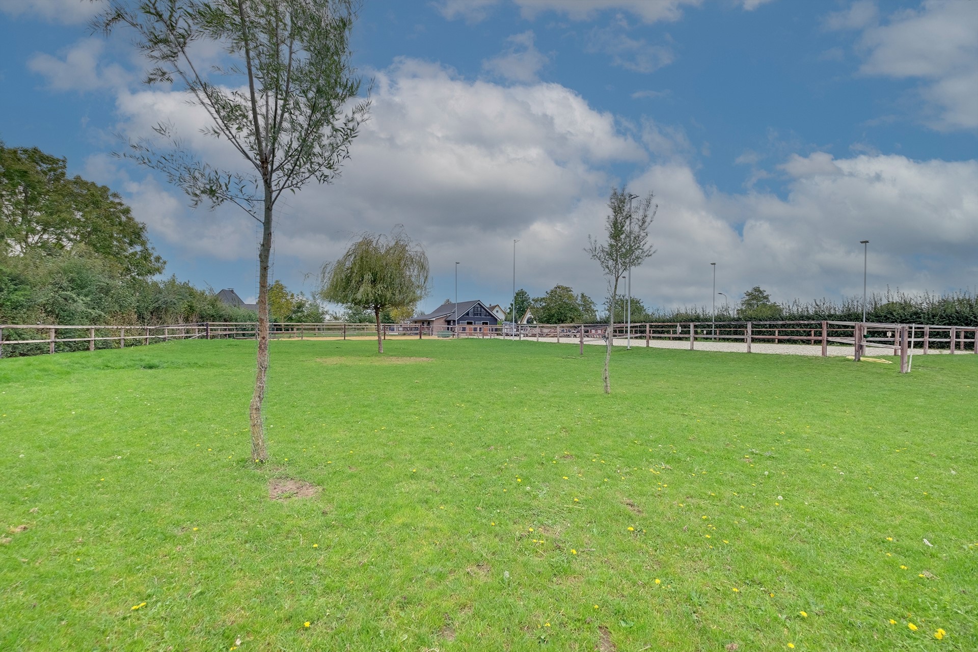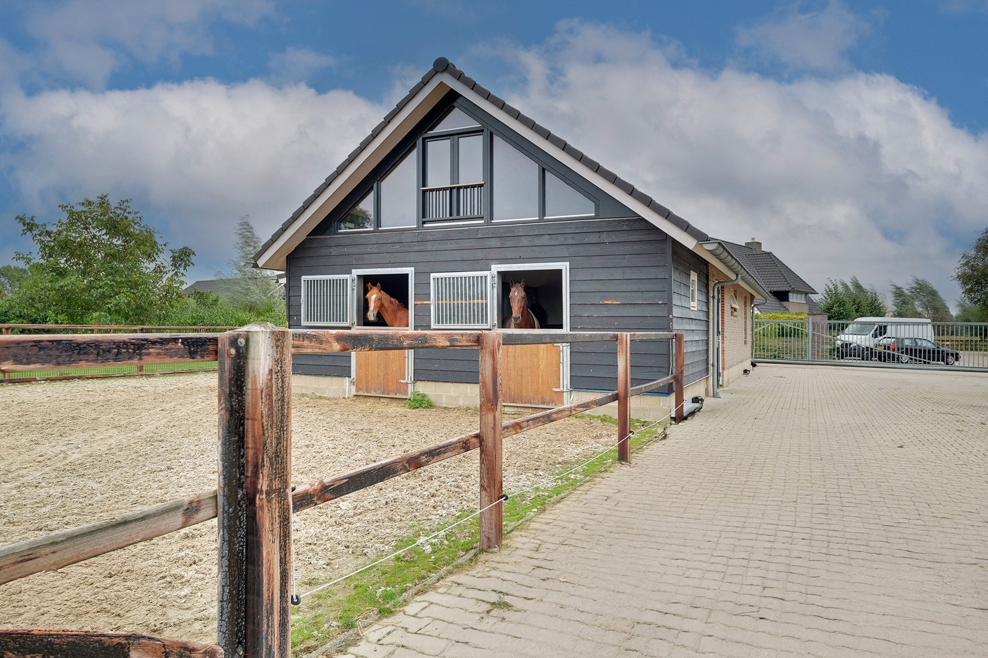 Het perceel rondom de woning is royaal en biedt een prachtige combinatie van vrijheid, privacy en functionaliteit. Achter de woning bevinden zich vier paardenstallen, een zadelkamer en ruimte voor opslag en bergruimte. Daarnaast heeft het bijgebouw een recent vernieuwde verdieping met een ontspanningsruimte of kantoor met prachtig uitzicht op het perceel. De professionele rijbak en dubbele paddock maken het ideale plaatje helemaal compleet.