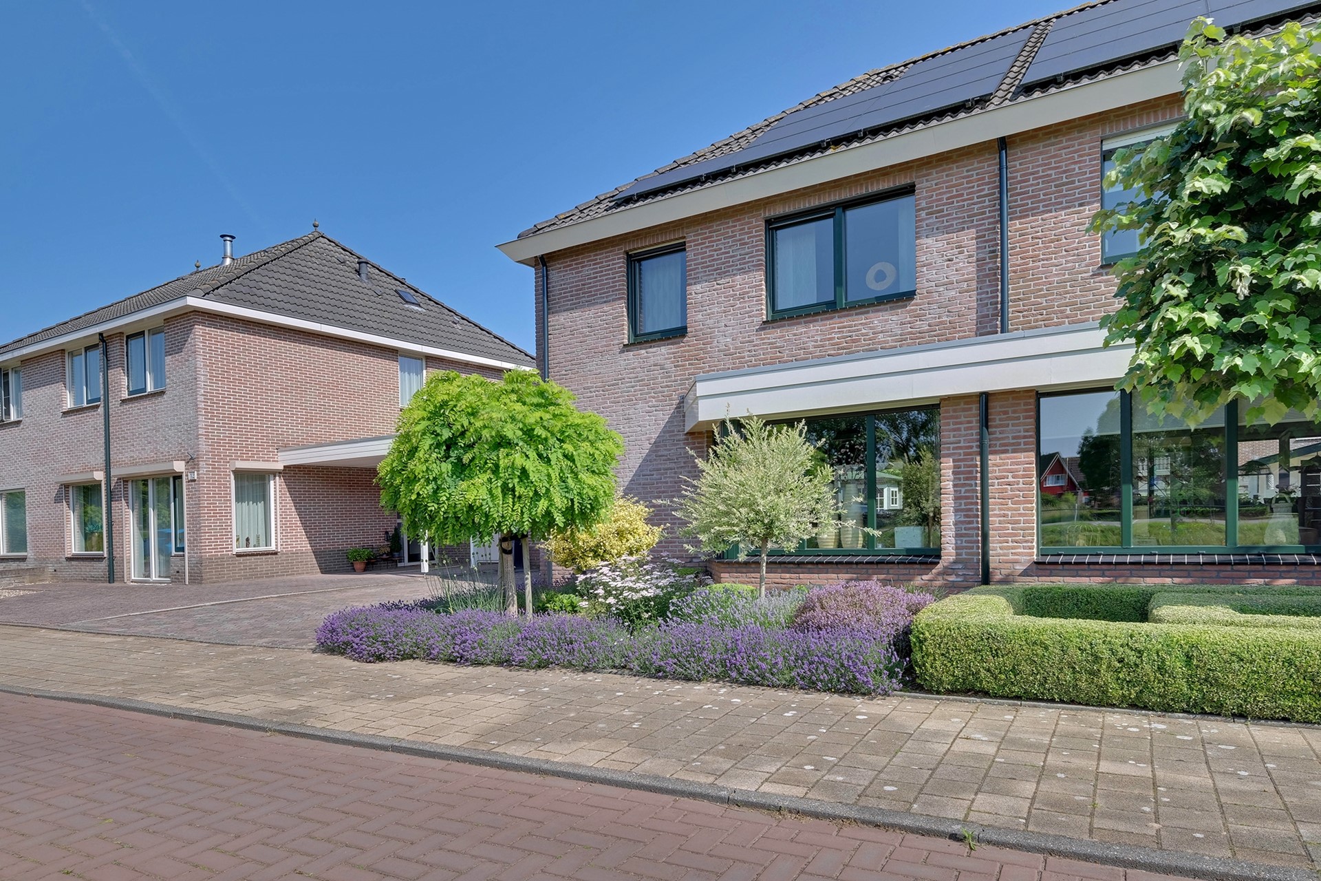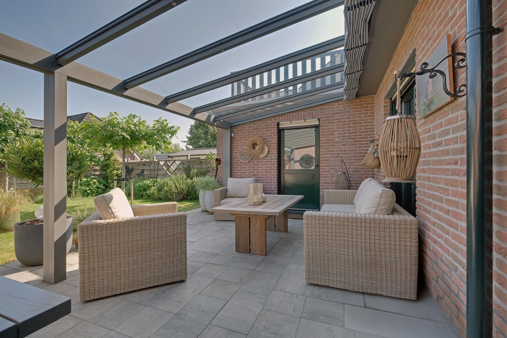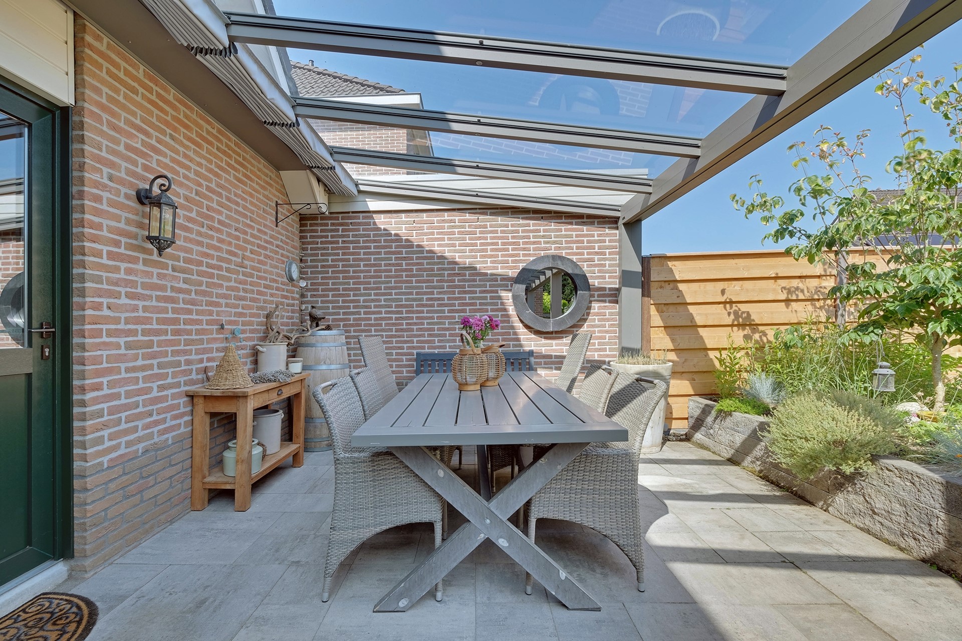 Entree, binnenkomsthal met trapopgang, toiletruimte voorzien van een zwevend toilet en fontein, deur naar garage. Ruime woonkamer met erker en parketlaminaatvloer, open keuken met hoekopstelling uiteraard voorzien van diverse inbouwapparatuur zoals koelkast, vaatwasser, oven, magnetron en 4-pits inductiekookplaat met afzuigkap. Middels een deur in de eetkamer is de bijkeuken te bereiken. De fraai aangelegde, groene achtertuin gelegen op het Noorden beschikt over meerder zitmogelijkheden, uitgerust met een vrijstaande houten berging en moderne ruime overkapping van circa 27 m2.