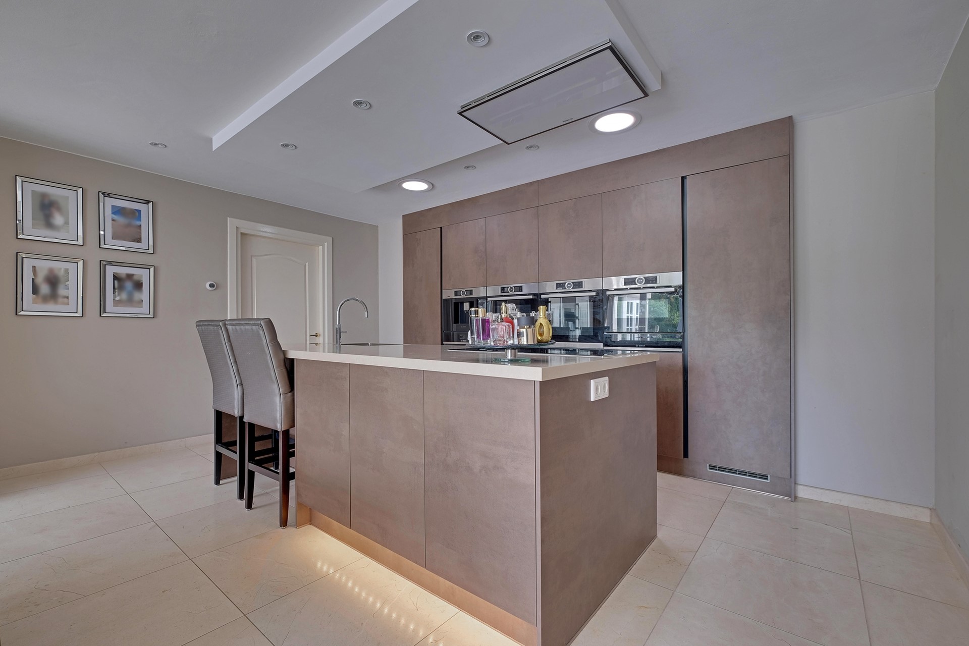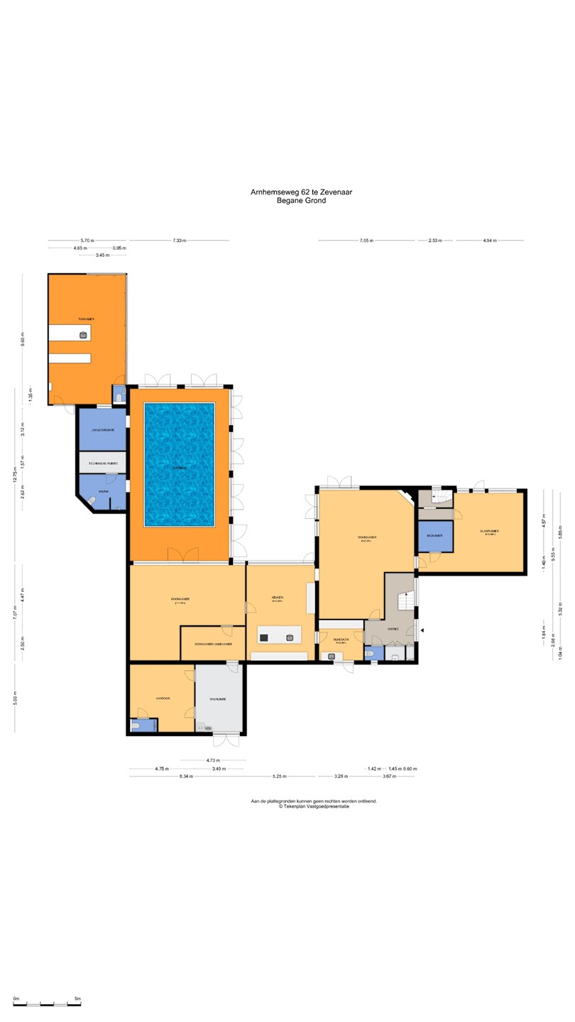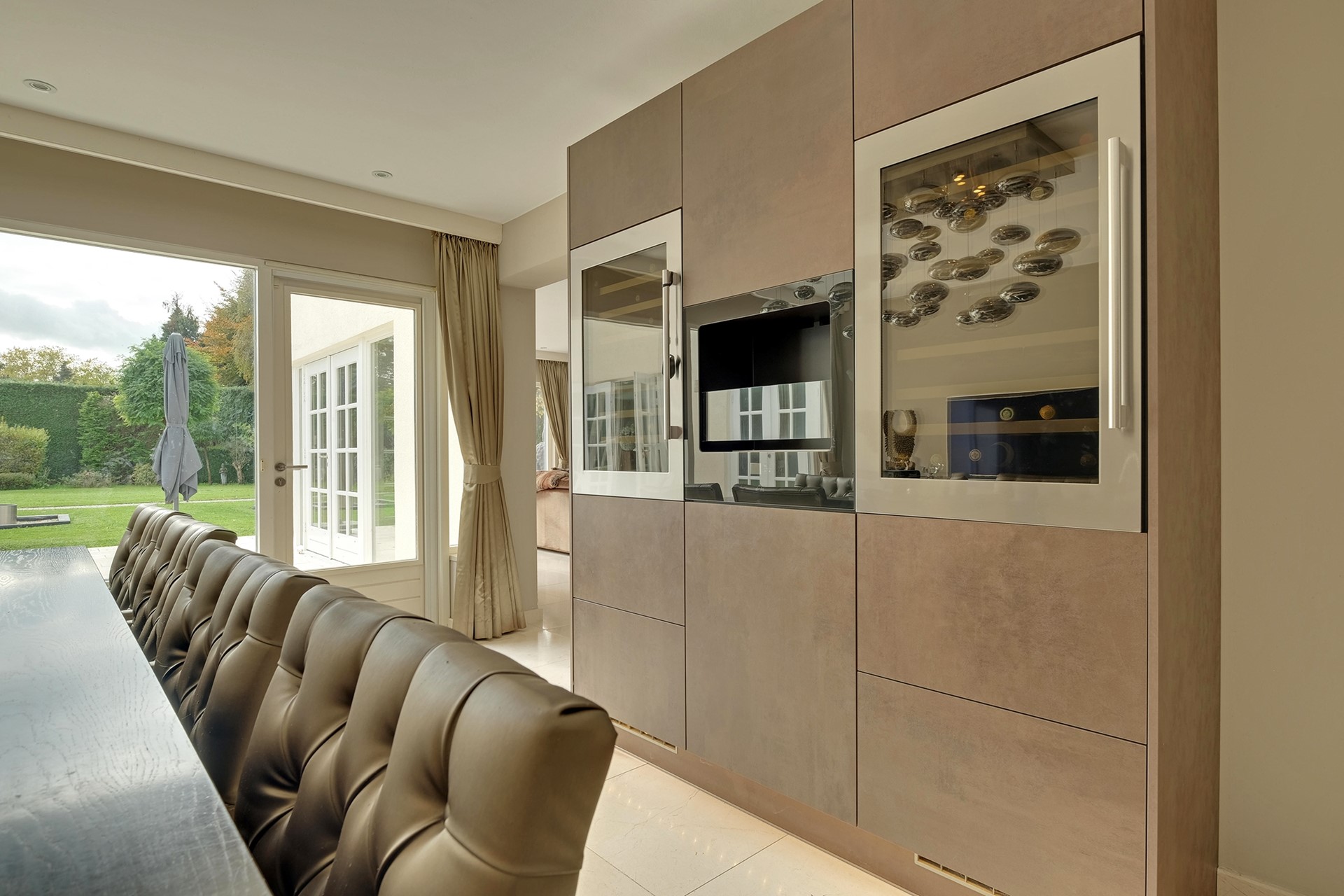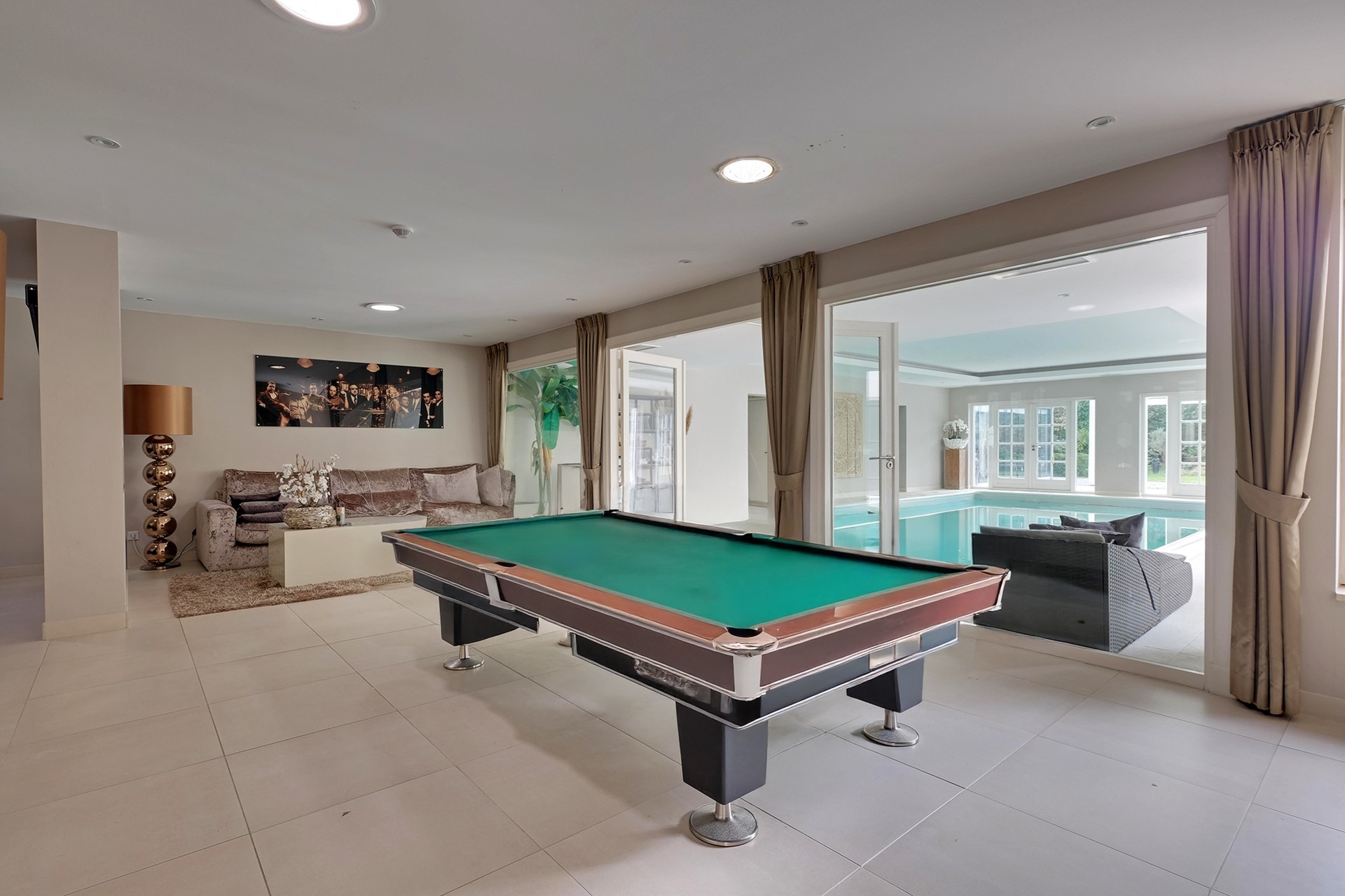 Middels de living lopen we door naar de prachtige leefkeuken en groeten we onze kok. Gemak dient de mens, dus uiteraard is de keuken uitgerust met een zeer uitgebreid scala aan inbouwapparatuur en loopt de keuken geruisloos door in de bijkeuken. De tweede living en een gameroom zijn prachtig grenzend aan het binnenzwembad gelegen. Voordat we een plons nemen komen we eerst aan bij de wasruimte en de extra (speel)kamer c.q. kantoor met eigen douche, toilet en wastafelmeubel.