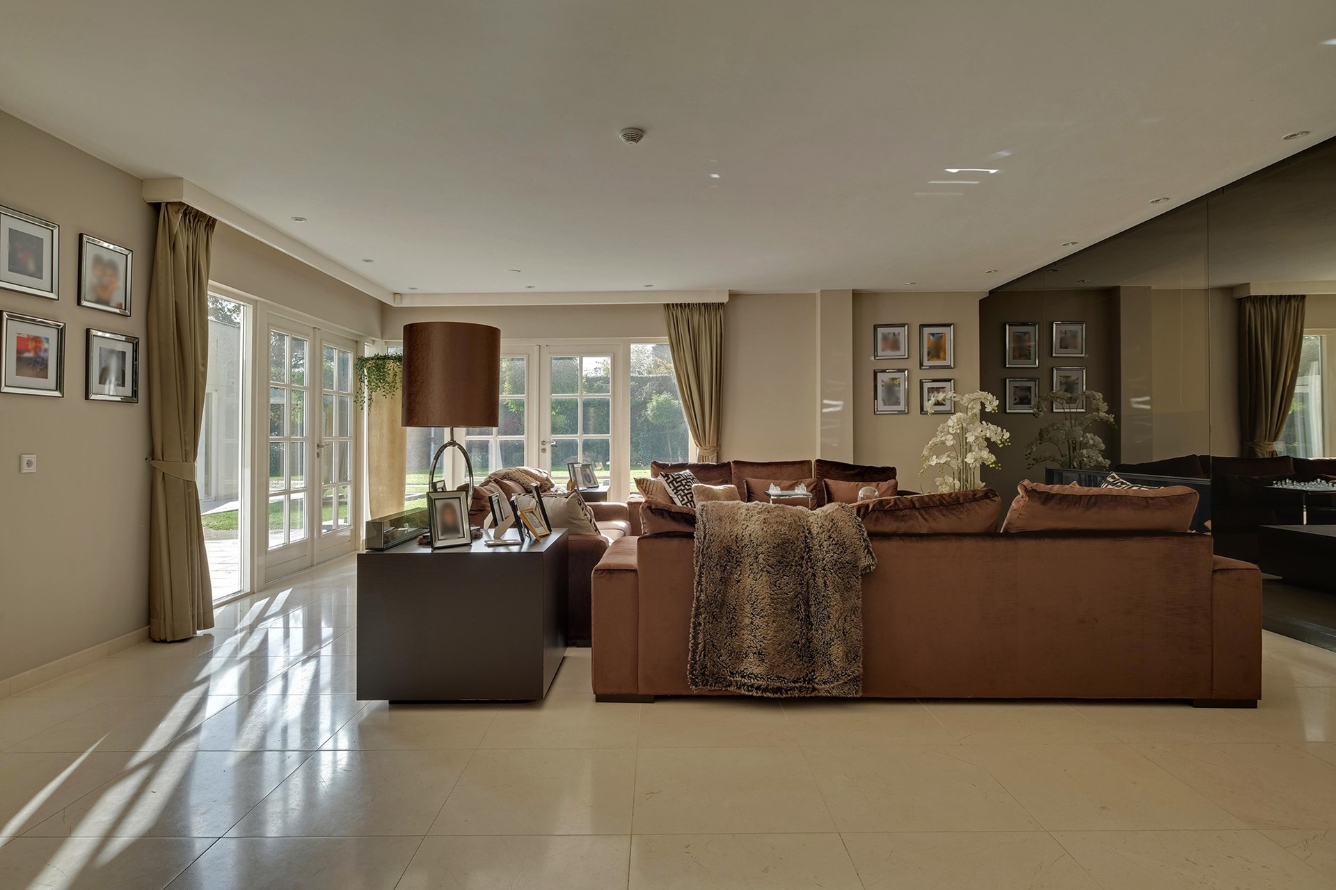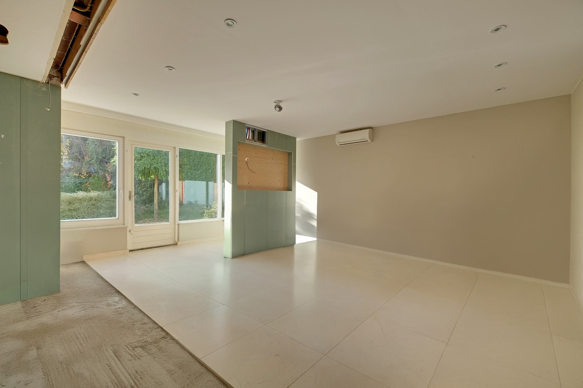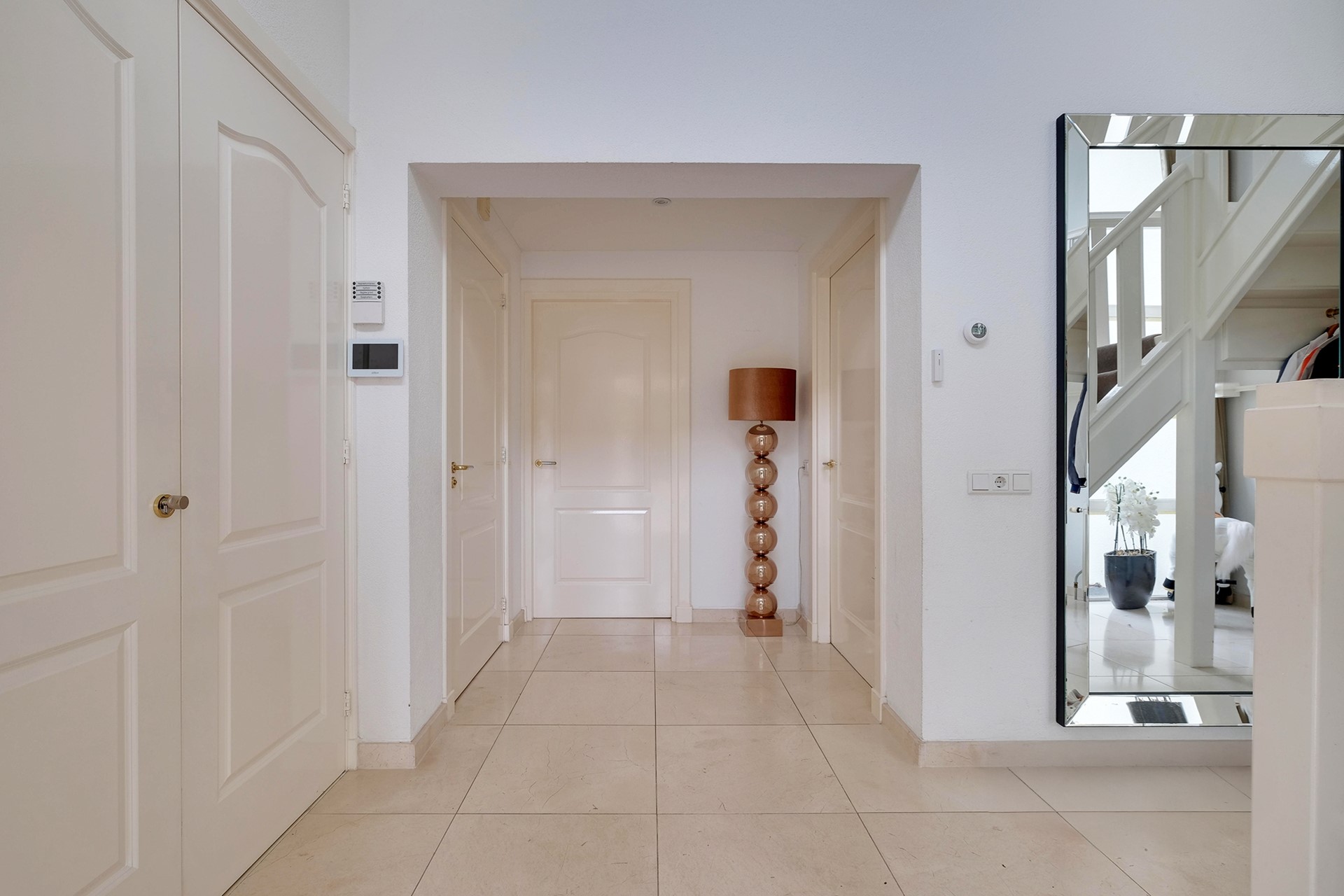 De entree met vide is nog eens mooi binnenkomen. De meterkast, technische ruimte en het eerste gastentoilet treffen we aan de binnenkomsthal. De eerste living met 2 dubbele openslaande deuren heeft een prachtig uitzicht over de tuin en is grenzend aan de masterbedroom op de begane grond welke is voorzien van airco en met een eigen badkamer in casco staat. Tevens treffen we hier een kelder.