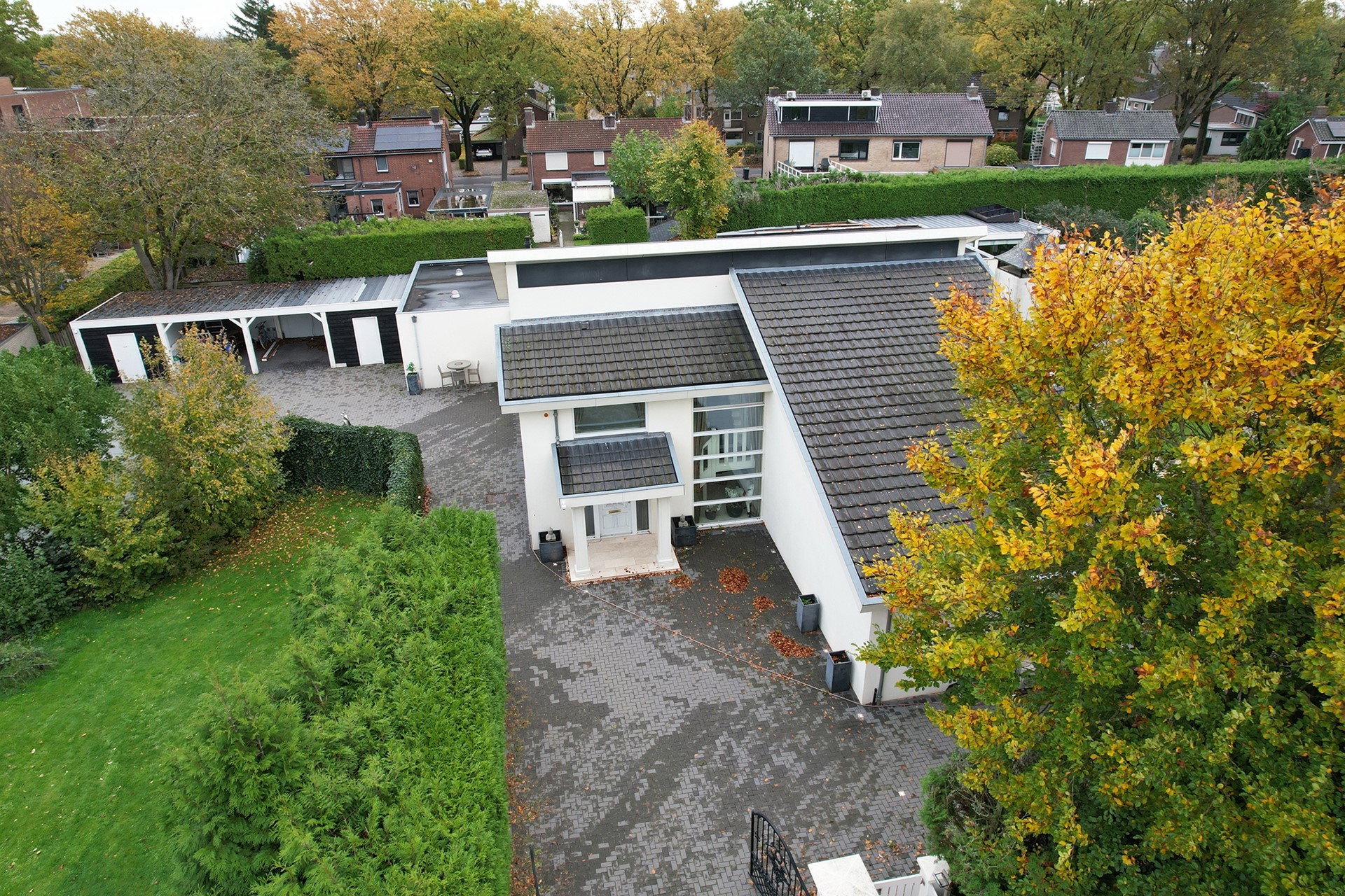 Onze Maserati Grand Turismo stallen we onder de overkapping waar plaats is voor het stallen van 2 auto’s en voldoende opslagruimte is in de bergingen.