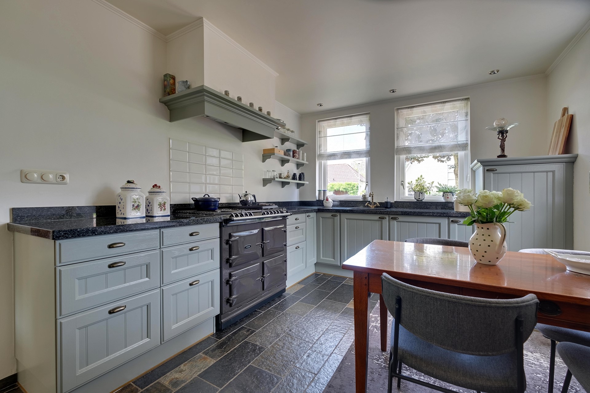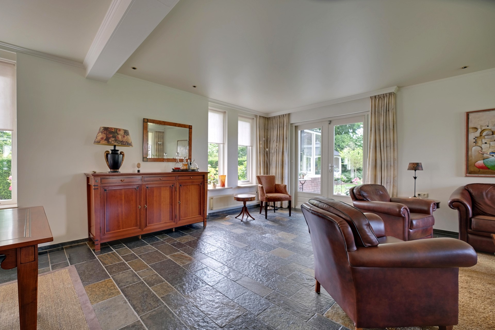 De fraaie, gietijzeren poort aan de voorzijde van het perceel verklapt de royale oprijlaan en oprit voor minimaal 3 a 4 auto’s. Middels de voordeur komen we in de ruime binnenkomsthal met meterkast en vide, de L-vormige woonkamer is tuingericht en heeft openslaande deuren naar de fraai aangelegde tuin. De dichte eetkamer is voorzien van een oudhollandse hoekkeukenopstelling voorzien van AGA-gasfornuis en gietijzeren oven, afzuigkap en koelkast. De ruime bijkeuken heeft toegang tot de achtertuin en de beschikking over een wasmachineaansluiting. De aangebouwde berging/werkplaats is volledig geïsoleerd en verwarmd en heeft een bergzolder.