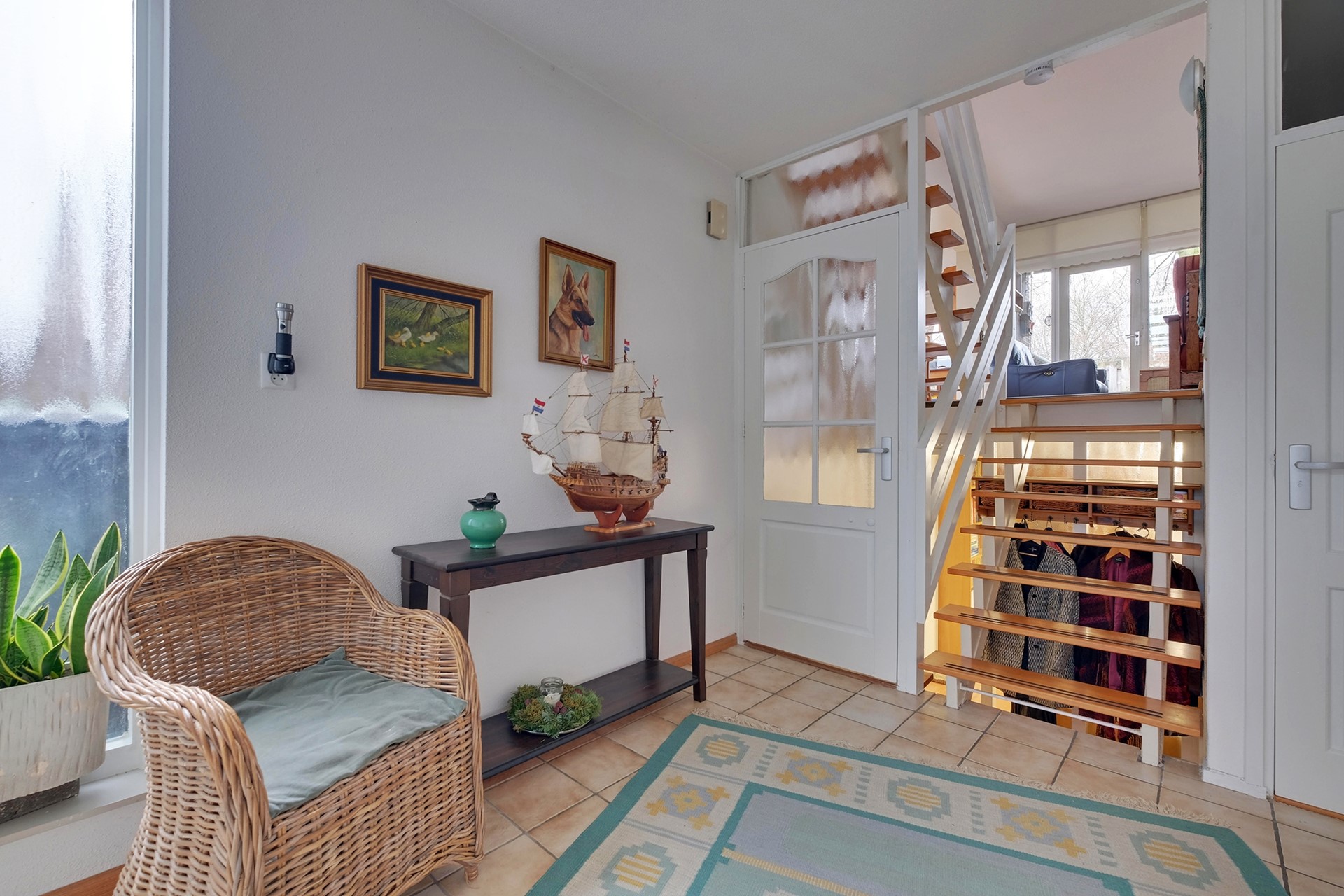 De uitgebouwde, lichte woonkamer beschikt over grote raampartijen, een schuifpui naar de tuin op het oosten en een afsluitbaar trappenhuis met glazen schuifdeuren.