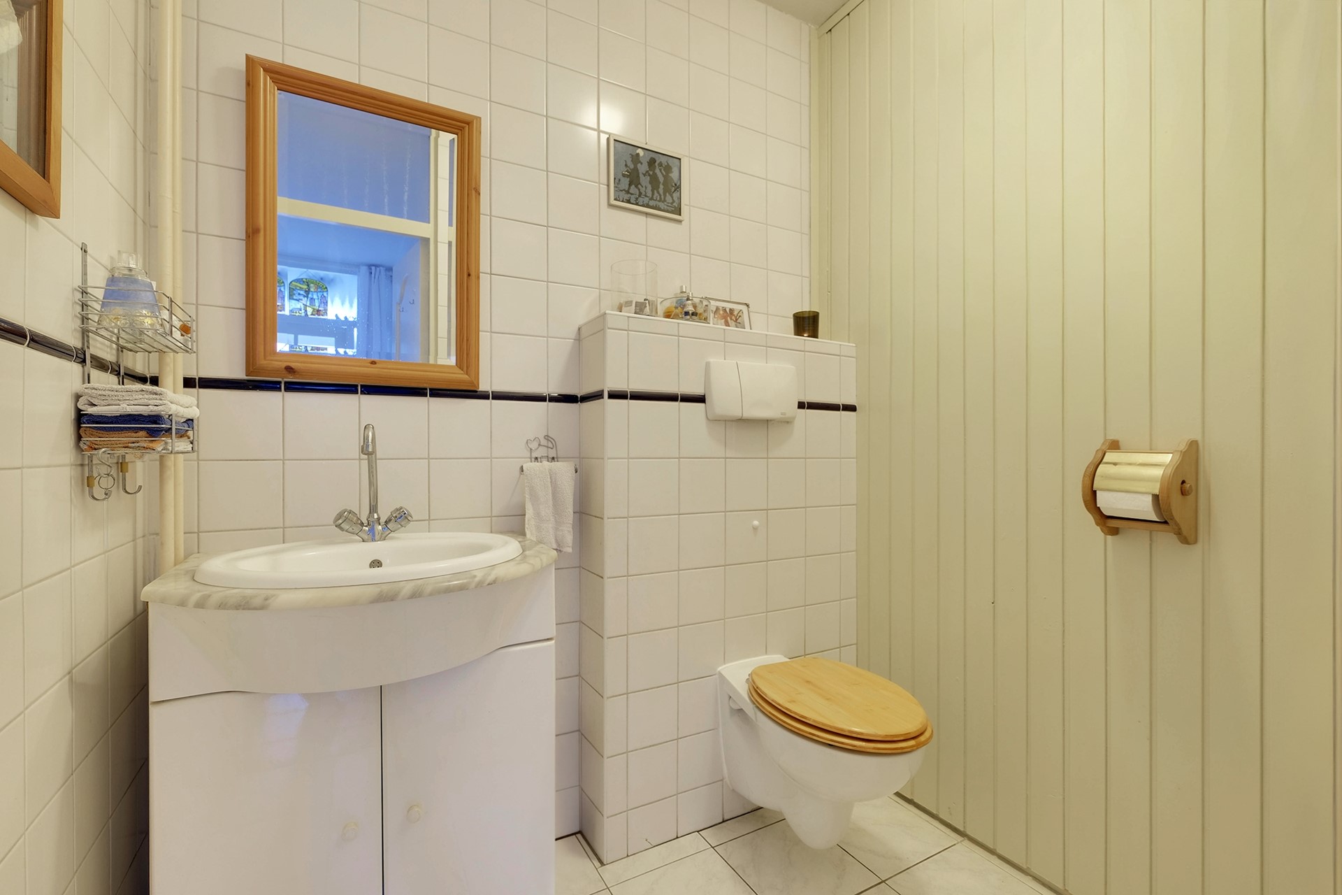 Ruime entree/hal met doorgang naar de inpandige garage/berging. De garage is volledig uitgerust met elektra, wateraansluiting, aansluitingen voor de wasmachine en droger en beschikt over dubbele deuren naar de oprit. Extra kantoor of slaapkamer en een ruim toilet met wastafelmeubel.