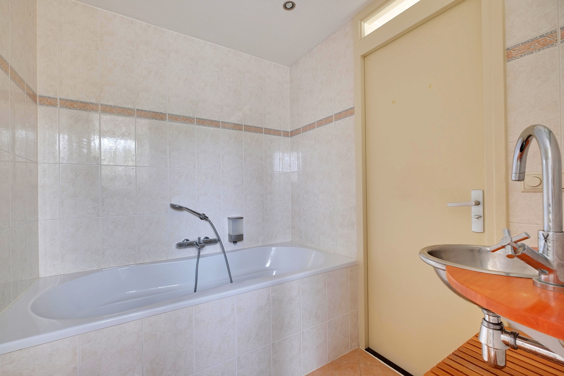 Overloop met toegang naar slaapkamer met airco. Badkamer voorzien van een ligbad, toilet, vaste wastafel en douche.