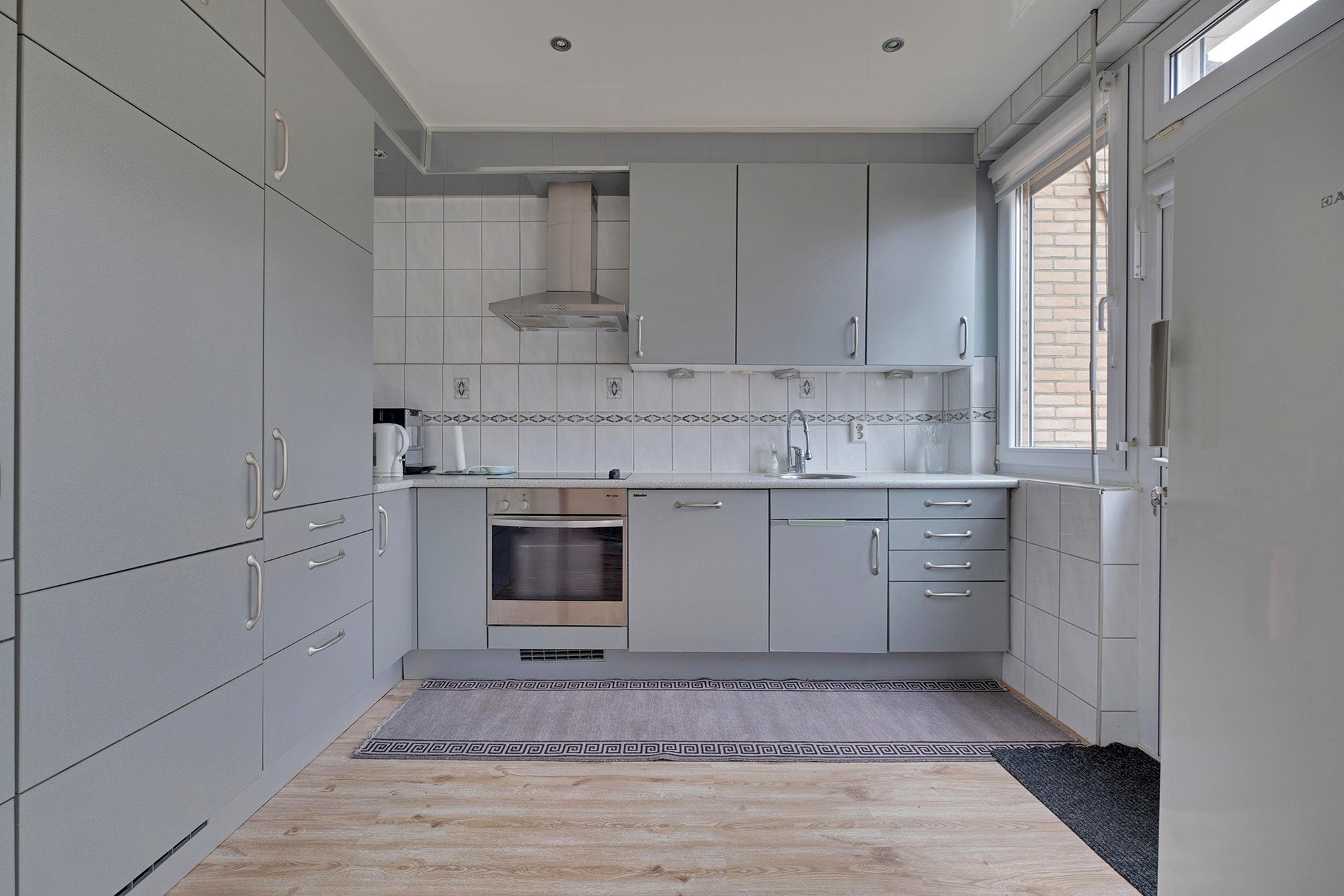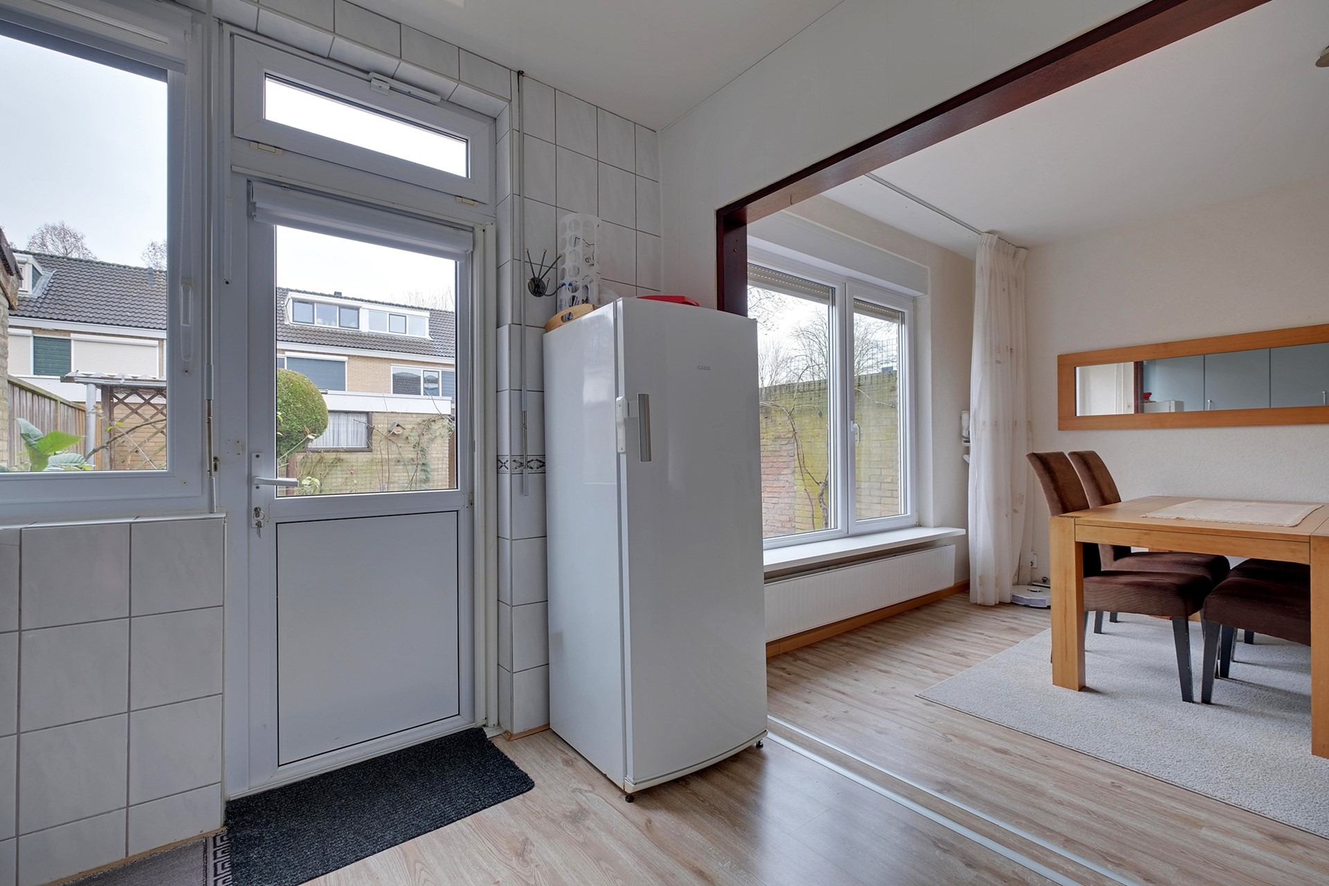 Entree, hal met toiletruimte, meterkast en provisiekast. Vanuit de hal stap je de lichte en ruime woonkamer binnen, voorzien van een nette laminaatvloer. De L-vormige keuken is uitgerust met diverse inbouwapparatuur en biedt voldoende opbergruimte. Vanuit de keuken heb je directe toegang tot de achtertuin, die gunstig is gelegen op het zuidoosten.